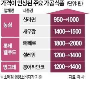 체감물가에 밀접한 상품인 라면, 과자 등 가공식품 가격이 줄줄이 오르고 있다.