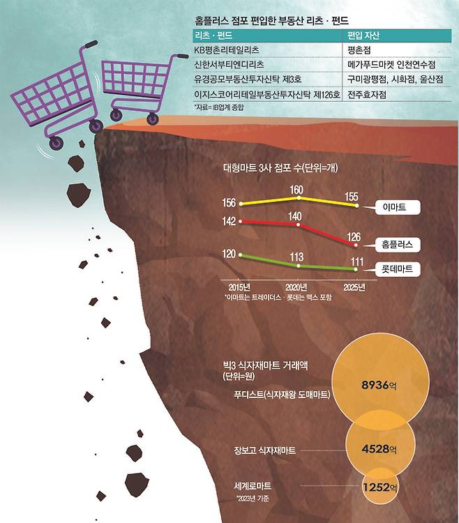 당장은 홈플러스 사태가 이마트와 롯데마트에 ‘반사이익’을 가져다줄 것으로 보인다. 한화투자증권 리포트에 따르면 이마트는 전체 점포 132곳 중 홈플러스와의 경합지가 약 70곳에 달한다. 유통업계 관계자는 “인구가 밀집한 주요 도심에는 대형마트 3사가 서로 출점해 있는데 홈플러스가 약해지면 그 수요를 기존 업체들이 흡수할 것”이라고 했다.