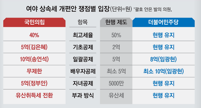 자녀 공제도 입장 차가 있다. 민주당은 일괄 공제액을 올리되 현행 1인당 5000만원인 자녀 공제는 건드리지 않는다는 입장이다. 임광현 의원이 발의한 상속세법 개정안을 보면 일괄 공제액을 8억원으로 올리는 방안이 포함돼 있다. 국민의힘 송언석 의원도 일괄공제액을 10억원으로 올리자는 개정안을 발의한 상태다.