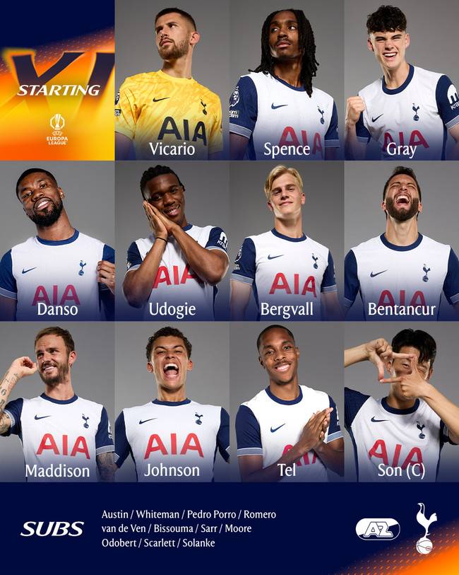 굴리엘모 비카리오, 제드 스펜스, 아치 그레이, 케빈 단소, 데스티니 우도기, 루카스 베리발, 로드리고 벤탄쿠르, 제임스 매디슨, 브레넌 존슨, 마티스 텔, 손흥민이 선발 출전한다.