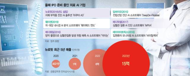업계에서는 첫 주자 뉴로핏의 IPO 가능성을 긍정적으로 평가한다. 감사보고서에 따르면 뉴로핏의 최근 5년간 매출은 2020년 4521만원, 2021년 1억원, 2022년 6억원, 2023년 15억원을 기록했다. 회사 측에 따르면 지난해에도 전년 대비 성장세를 이어갔을 것으로 보인다. 특히 치매 치료 시장이 커지면서 최근 국내와 일본에서 인증받은 ‘아쿠아 AD’의 매출이 늘어날 것으로 기대하고 있다. 아쿠아 AD는 치매 부작용을 진단하는 솔루션이다. 회사 관계자는 “아쿠아AD 등 준비된 사업 플랜들이 예정대로 실현될 수 있도록 힘을 쏟을 예정”이라며 “빅파마와 진행 중인 뇌질환 관련 공동연구도 거래소의 중요 심사 기준이 될 것으로 보고 있다”고 말했다.