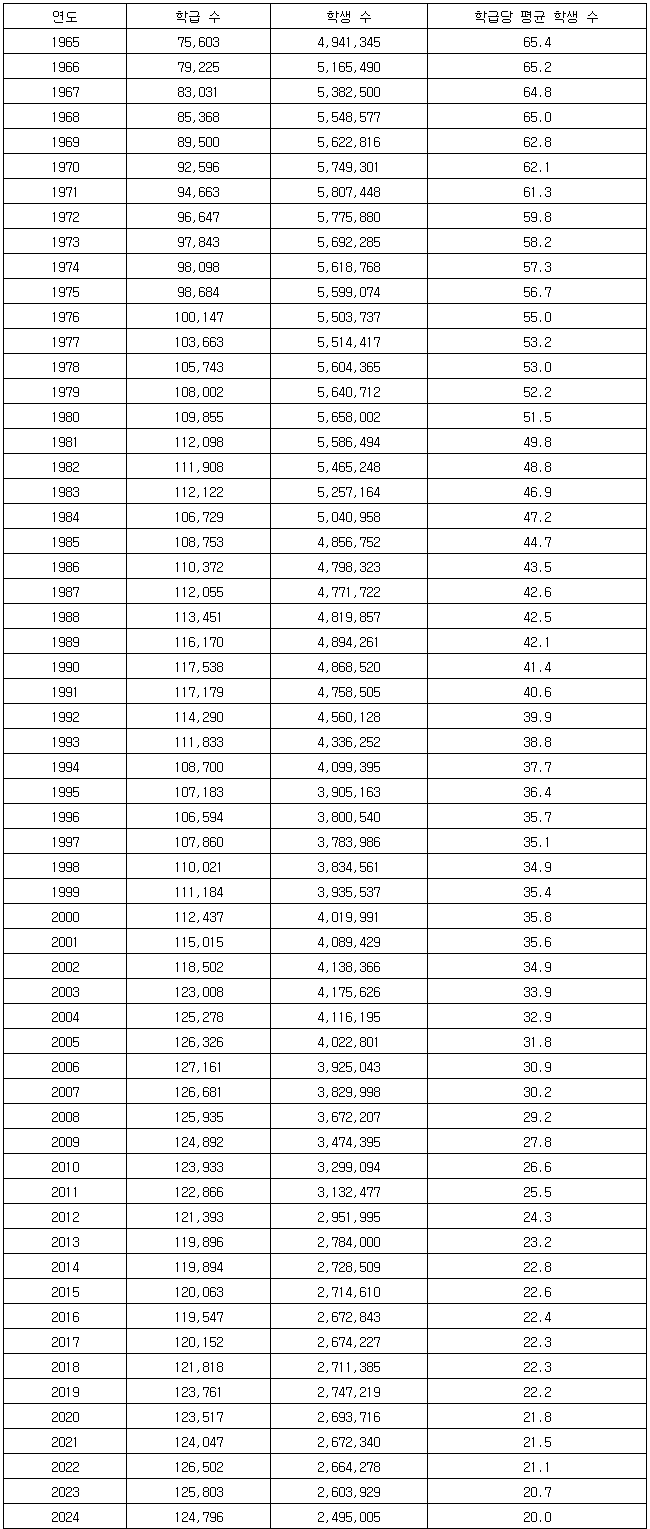1970년대엔 학급당 평균 학생 수가 50명대였고, 1980년대 들어 40명대, 1990년대 30명대로 순차적으로 감소했다.
