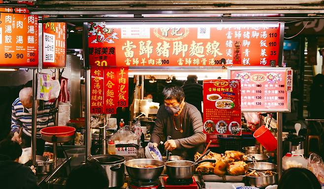 곱창국수와 총요빙(밀가루와 파로 만든 파 전병), 루러우판, 볶음면, 만두, 과일, 생선죽, 국수, 꼬치구이 등 갖가지 메뉴가 있고, 음식당 100~150TWD(약 4,440~6,660원) 선이라 가격마저 부담 없다. 게다가 플라스틱 의자에 앉아 야외에서 식사하니 타이베이의 수수한 감성에 한껏 젖어 든다.