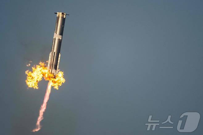 (보카치카 AFP=뉴스1) 우동명 기자 = 일론 머스크의 스페이스X '스타십' 로켓이 6일(현지 시간) 텍사스주 보카치카 해변 스타베이스 우주 발사시설에서 8차 지구궤도 시험비행을 위해 발사 후 1단 로켓 부스터는 발사대로 돌아 오고 있다. 2025.03.07