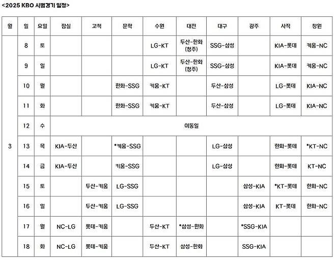 2025 KBO 리그의 시작을 알리는 KBO 시범경기가 3월 8일 오후 1시 수원(LG 트윈스-KT 위즈), 청주(두산 베어스-한화 이글스), 대구(SSG 랜더스-삼성 라이온즈), 사직(KIA 타이거즈-롯데 자이언츠), 창원(키움 히어로즈-NC 다이노스) 5개 구장에서 막을 올린다.