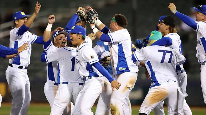 ▲ 브라질 선수들이 독일을 6-4로 꺾고 2026 월드 베이스볼 클래식(WBC)에 진출한 후 기뻐하고 있다.