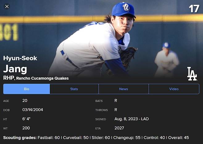장현석은 최근 MLB.com이 발표한 구단별 유망주 랭킹에서 다저스 유망주 17위에 이름을 올렸다. 투수로만 한정하면 팀 내 7위다.