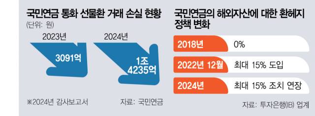 7일 서울경제신문이 확보한 국민연금 ‘2024년 감사보고서’에 따르면 국민연금은 지난해 말 기준 통화 선물환 거래(통화선도·외환시장 직접 개입)로 1조 4234억 원의 평가손실을 입었다. 이는 전년 말 기준 손실액인 3090억 원 대비 4배 이상 폭증한 금액이다. 직접 거래 외에도 외환 스와프 등 다른 환헤지 전략이 있다는 점을 감안하면 추가 손실도 있을 수 있다.