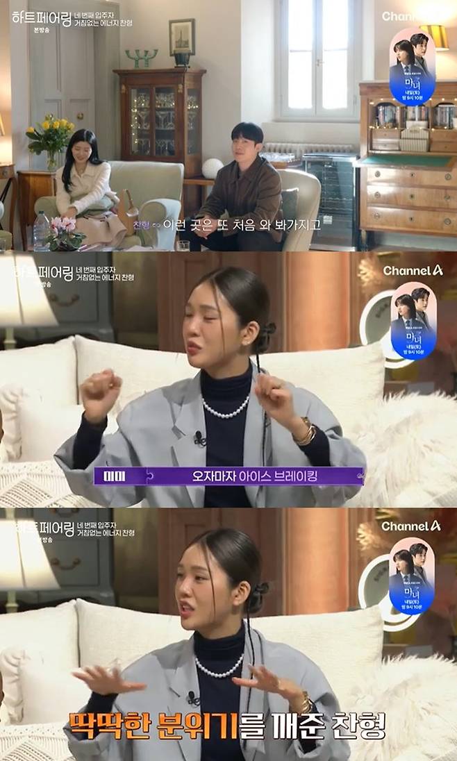 이어 등장한 찬형은 '페어링 하우스'를 구경한 뒤 감탄을 금치 못했다. 그러면서 입주자들에게 "여기 몇 층이냐"고 물으며 아이스 브레이킹을 하는 등 남다른 친화력을 보여줬다. 이에 미미는 "제가 좋아하는 성격 스타일이다. 오자마자 아이스 브레이킹 가볍게 해주시고. 딱딱한 분위기를 자연스럽게, 부드럽게 만들어주시는 거 같다"며 찬형을 칭찬했다.