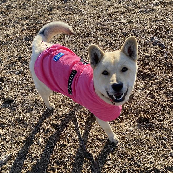 장수 역시 보호소의 교육 덕에 사회성이 향상되는 등 입소 초기와는 많이 달라졌다고 합니다. 실제 취재진을 만난 장수는 곧장 꼬리를 힘껏 흔들며 다가와 몸을 부딪히며 반가움을 표현하는 등 애교 넘치는 모습이었습니다. 게다가 생애 첫 목욕을 마쳤다는 장수는 분홍색 옷을 차려입은, 보송하고 깔끔한 모습이었죠. 구조 영상 속 털빛은 누런 갈색 빛이었는데 실제로 보니 깔끔한 베이지색이었습니다.