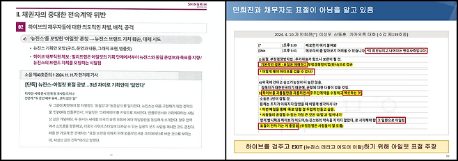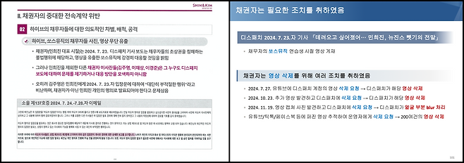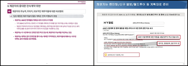 뉴진스 측은 피피티 93장 준비해 신뢰 파탄의 이유를 설명했다. 13가지 이상의 이유를 들었다. 어도어 측은 피피티 총 229장을 준비했다. 뉴진스측의 주장을 하나하나 반박했다.
