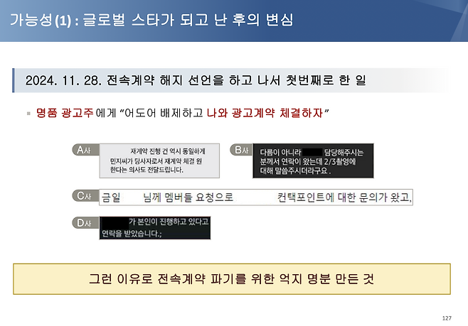 어도어: 2024년 11월 28일, 뉴진스는 기자회견에서 "계약된 스케줄은 이행할 것이고, 광고도 예정대로 진행할 것"이라고 말했다. 실제로는 계약 해지 선언 이후 이미 촬영한 것과 릴리즈 앞둔 건에 날인을 거부했다. 명품 브랜드 광고주(A, B, C, D사)들에 '어도어를 배제하고 본인들과 광고 계약 체결하자'는 취지로 연락하기도 했다.
