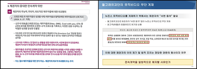 어도어: 어도어-돌고래유괴단 간 용역위탁계약 제 10조 제2항에는 '산출물에 대해 사전 서면 동의 없이 유포하거나 게시하지 않는다'고 명시 되어있다. 즉, 어도어의 서면 동의 없이 뮤직비디오를 무단으로 게재하고 멤버들의 초상권을 사용한 것. 특히 광고주(애플)의 컴플레인도 제기된 상황이었다. 법적 조치는 당사의 정당한 권한 행사이자 의무다.