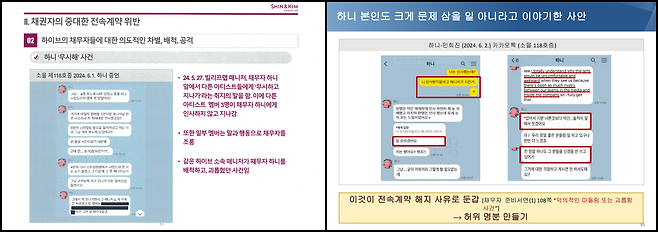 어도어: 하니는 민희진에게 아일릿 멤버 3명이 모두 인사를 했다고 밝혔다. 하니가 '무시해'라고 말한 게 아니라, 민희진이 먼저 꺼낸 말이다. '니 인사 받지 말라고 매니저가 시킨 거냐'고 묻자, 하니는 '잘 모르겠어요'라고 답한다. 전속계약 해지 사유를 만들기 위한 허위 명분이다.