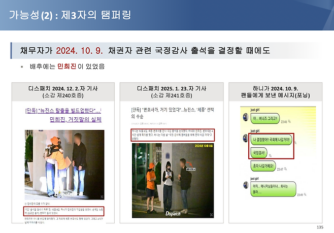 뉴진스: 디스패치에서 공개한 영상은 연습생 시절이 포함된 것으로, 동의 없이 기사화됐다. 유출 주체는 하이브 혹은 쏘스뮤직일 것. 뉴진스의 초상권을 침해하는 위법 행위다. 민희진은 쏘스뮤직에 강경히 대응할 것임을 밝혔지만, 김주영 등은 대응 방안을 모색하지 않았다. 뉴진스를 보호할 의사와 의지가 없었다.