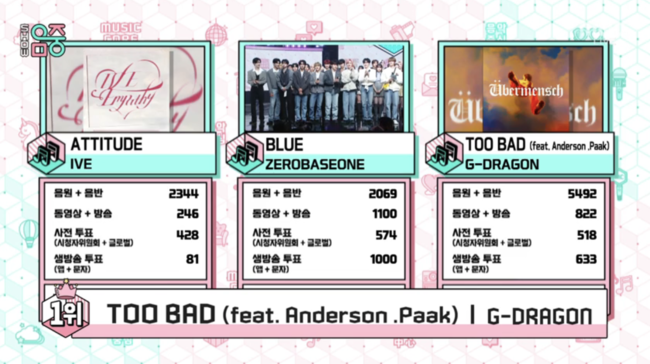 아이브의 'ATTITUDE', 제로베이스원의 'BLUE', 지드래곤의 'TOO BAD (feat. Anderson .Paak)'가 1위 후보에 오른 가운데 지드래곤이 '쇼! 음악중심' 1위를 차지했다.