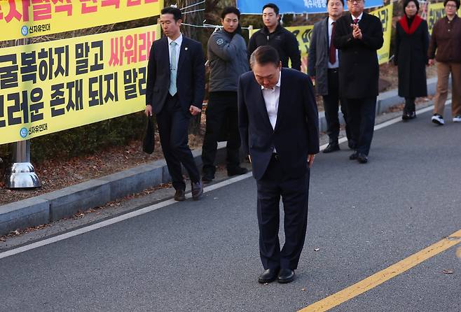 100여m를 걷는 내내 윤 대통령은 거듭 허리를 숙여 인사했다. 마지막 위치에서도 다시 한 번 지지자들에게 고마움을 표하며 90도 인사를 한 뒤에야 차량에 탑승했다.