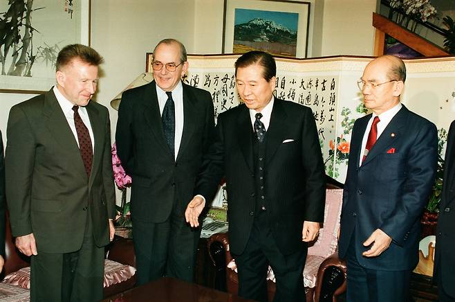 | ▲ 1998년 1월 12일 당시 김대중 대통령당선자가 캉드쉬 IMF총재와 나이스 IMF협상대표단장(왼쪽), 박태준 자민련총재 등과 만나 환담을 나눈뒤 식당으로 접견자들을 안내하고 있다. |