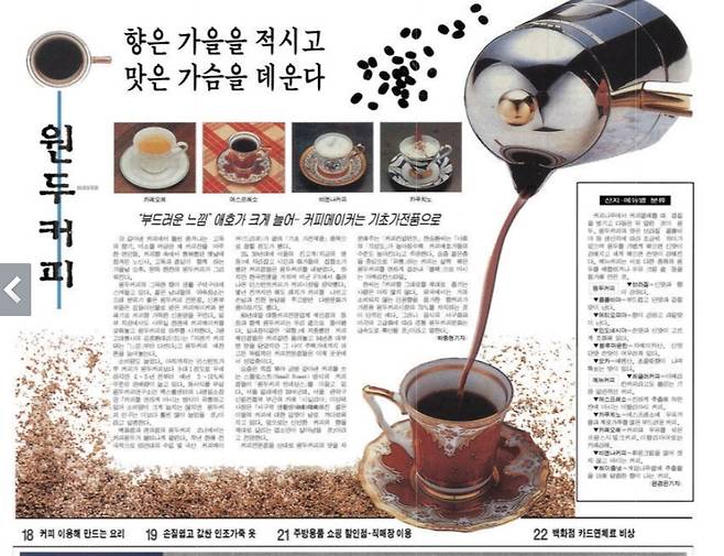 가을이 깊어져 가던 10월 18일 <동아일보>는 '홈&쇼핑' 코너 두 면을 커피 이야기로 채웠다. 주제는 역시 원두커피였다. 직접 볶아 금방 갈아낸 커피를 쓰는 '스몰로스트' 방식의 커피점들이 '원두커피 르네상스'를 이끌고 있다는 소식을 감미롭게 전하였다. "향은 가을을 적시고, 맛은 가슴을 데운다"는 기사 제목을 보고 커피 생각이 나지 않을 수 없을 지경이었다.