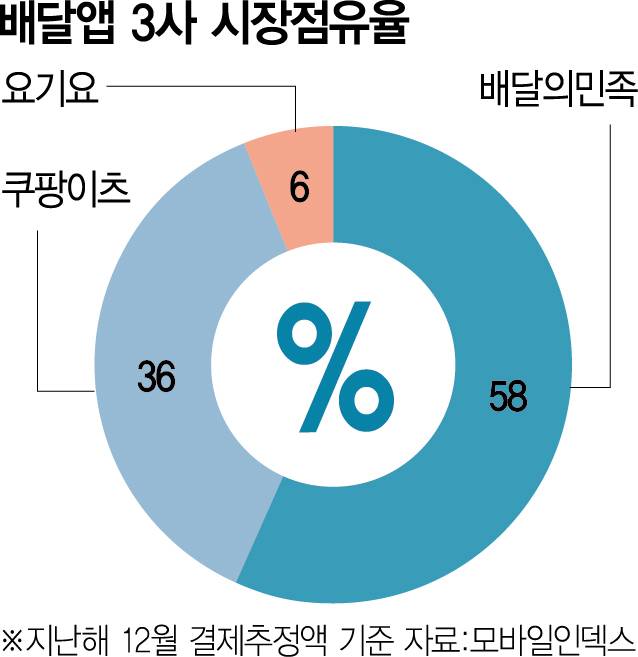 공정위는 특히 양 사의 합산 시장점유율이 94%에 달해 사실상 시장 지배적 사업자라는 점에 주목하고 있다. 지난달 대법원에서 최저가 강요와 관련해 무죄 판결을 받은 요기요와 달리 업계 투톱인 동시에 최혜 대우를 적용하면서 경쟁 제한성이 있다는 게 공정위의 설명이다. 공정위 관계자는 “행위의 본질은 요기요 때와 유사하나 시장 지배적 지위를 지닌 업체들이 동시 다발적으로 최혜 대우를 진행했다는 데서 경쟁 제한성이 훨씬 크게 나타났다”고 지적했다.