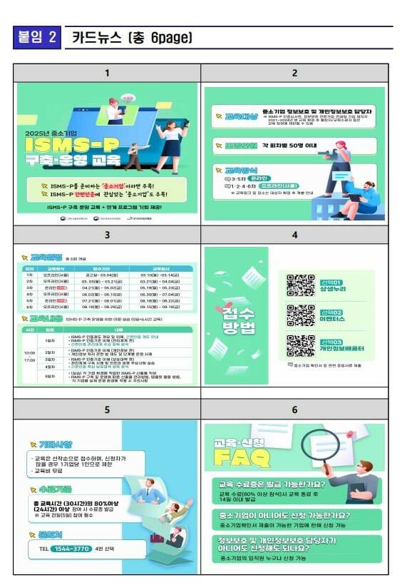 9일 과학기술정보통신부(과기정통부)와 개인정보보호위원회(위원장 고학수), 한국인터넷진흥원(원장 이상중, KISA)는 국내 영세‧중소기업들의 보안 역량 강화를 위해 '정보보호 및 개인정보보호 관리체계(ISMS-P, Information Security Management system & Personal Information) 구축‧운영 교육'을 실시한다고 밝혔다.