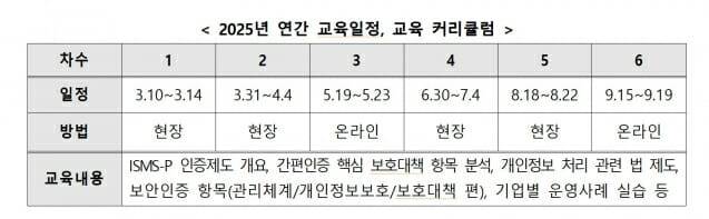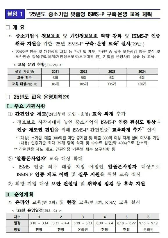 특히 올해 교육은 기업 부담 경감을 위해 도입, 운영 중인 ISMS-P 간편인증(’24년~) 교육과정을 추가해 영세기업들의 보안수준 향상과 자발적인 인증 취득을 돕고, 정보보호 사각지대 해소에 기여하기 위해 마련했다. 'ISMS-P 간편인증'은 중소기업의 규모 및 특성에 따라 필수 보안점검 항목 위주로 완화한 인증기준과 비용으로 인증을 취득할 수 있도록 한 인증 특례 제도(’24.7. 도입 및 시행)다.
