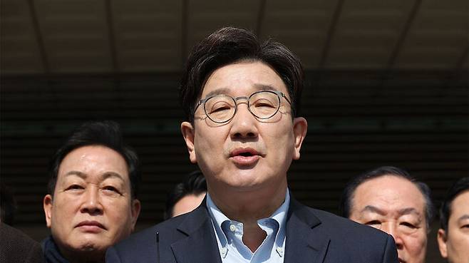 ▲ 국민의힘 권성동 원내대표가 8일 서울 대검찰청 앞에서 열린 비상의원총회에서 발언하고 있다. (사진=연합뉴스)