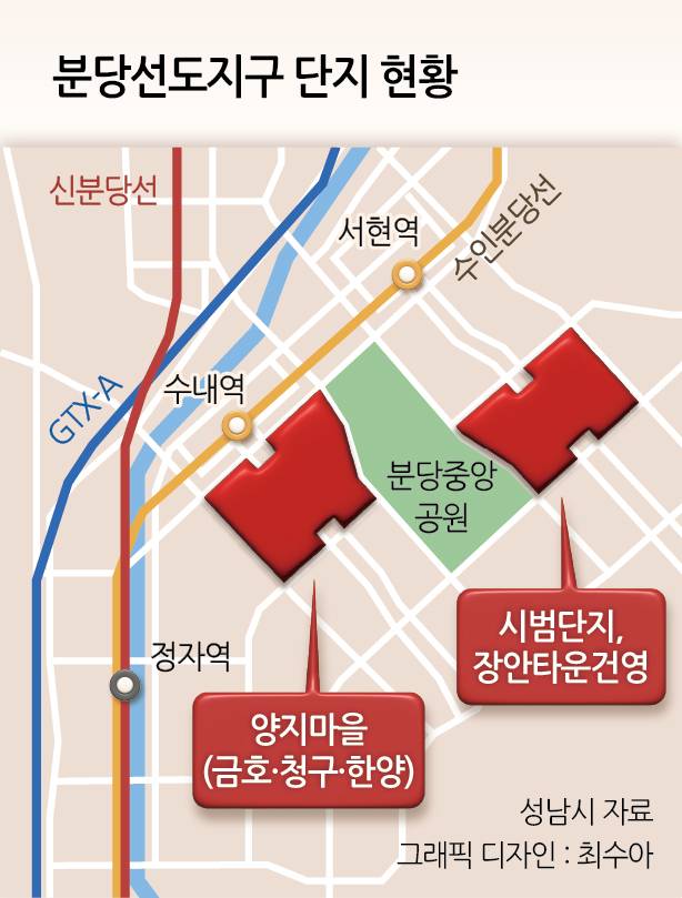 이 같은 갈등이 불거진 건 4392가구, 6개 단지로 구성된 양지마을 추진 단지의 입지·가구 수·대지지분이 제각각이어서다. 양지마을 1단지 금호아파트는 6개 단지 중 수인·분당선 수내역에서 가장 가까워 각자 기존 자리에 다시 아파트를 올리는 제자리 재건축을 요구하고 있다. 반면 통합재준위는 제자리 재건축을 보장할 수 없다는 입장이다.