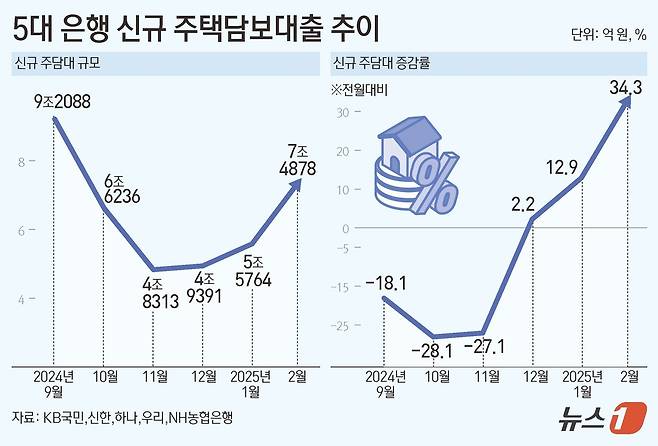 (서울=뉴스1) 김초희 디자이너 = 난달 5대 은행(KB국민·신한·하나·우리·NH농협)의 신규 주택담보대출(주담대) 취급액이 7조5000억 원에 육박하는 것으로 나타났다. 지난 1월(5조5764억 원) 대비 34.3% 증가한 수치다.
