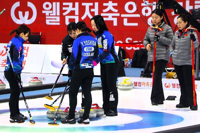 | ▲ 웰컴저축은행 강릉 인비테이셔널 국제컬링대회 기간 펼쳐진 '중일전'의 모습. 왼쪽은 로코 솔라레(팀 후지사와 사츠키), 오른쪽은 중국의 '팀 왕루이'. |