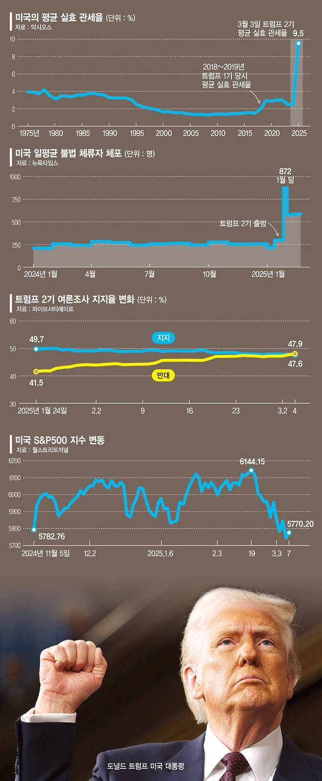 대선 기간에 대규모 감세와 사회기반시설 건설을 약속했던 트럼프는 바닥을 드러내는 예산에 초조함을 느끼고 있다. 그는 취임과 함께 일단 야당과 긴 싸움을 벌여야 하는 감세나 규제 완화 논의는 뒤로 미루고, 행정명령으로 비교적 빨리 걷을 수 있는 관세에 집중했다. 트럼프는 캐나다·멕시코 수입품과 중국 수입품에 각각 25%, 20% 추가 관세를 부과했으며 12일에는 철강·알루미늄 수입품에 25% 관세를 추가한다. 4월 이후에는 미국보다 관세율이 높은 국가에 보복하는 '상호 관세'와 농산물 추가 관세가 시행된다. 트럼프는 이외에도 자동차와 반도체, 의약품, 목재, 구리에 추가 관세를 준비 중이다.