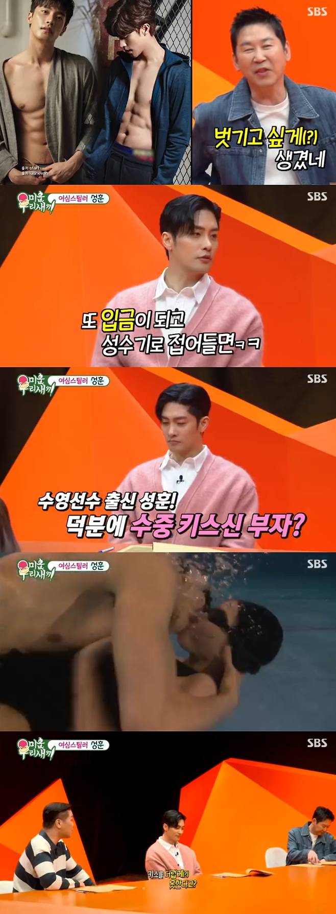 이어 공개된 성훈의 상의 탈의 사진에 신동엽은 "벗기고 싶게 생겼네. 벗어야겠네"라며 너스레를 떨었다.