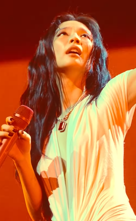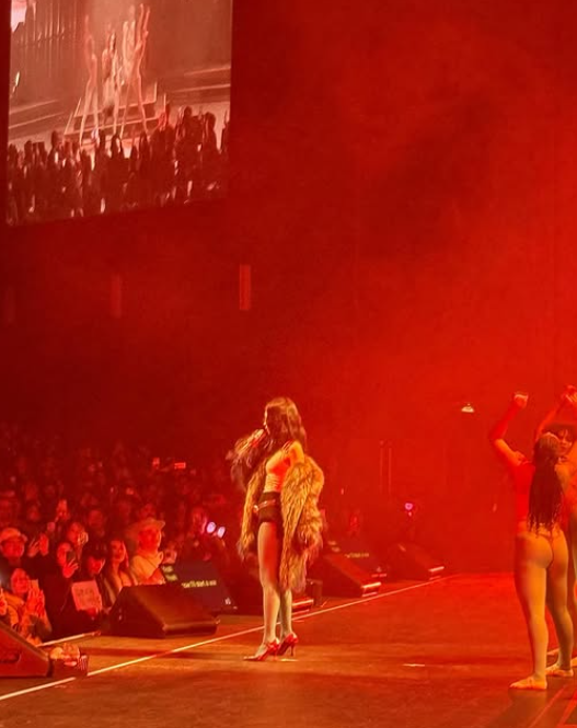 또 다른 사진에서는 퍼(Fur) 재킷을 걸친 채 붉은 조명 속에서 무대를 장악하는 모습이 포착됐다. 무대 전체를 활용하는 퍼포먼스와 역동적인 안무가 돋보이지만, 일부 팬들은 의상이 다소 과감하다는 의견을 내놓았다.