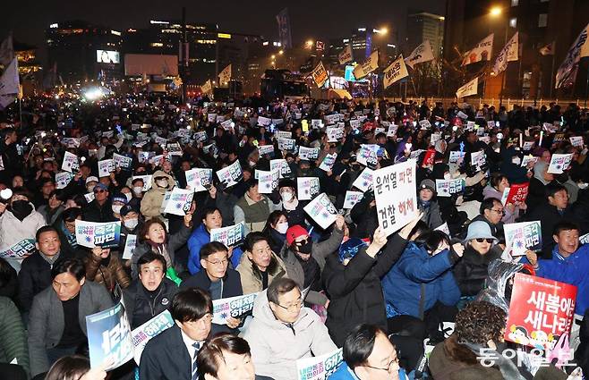 | “찬탄” 9일 오후 서울 종로구 광화문 앞에서 ‘윤석열 즉각퇴진 사회대개혁 비상행동’이 윤석열 대통령 탄핵을 촉구하는 집회를 열었다. 참가자들은 ‘윤석열 파면’ 등이 적힌 피켓을 들고 탄핵 찬성을 외쳤다. 신원건 기자 laputa@donga.com |