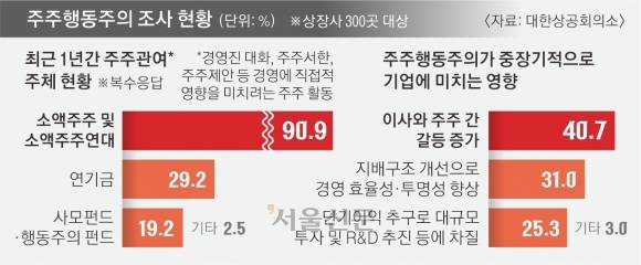 이런 상황에서 이사의 충실의무를 주주까지 확대하는 내용의 상법 개정안이 통과하면 주주관여 활동이 더욱 증가할 것으로 보인다. 대한상의는 “현재도 주주제안 및 대표소송을 통해 주주 권익이 보장되는 만큼 상법 개정에는 신중해야 한다”고 강조했다.