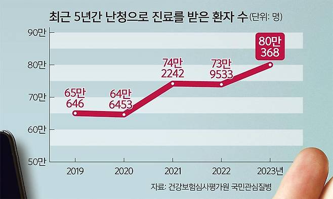 2023년 난청으로 진료를 받은 환자 수는 80만368명. 2019년 65만646명보다 23%가 증가한 수치다. 이 중 가장 많이 증가한 연령대는 10대다. 2019년 2만4539명이던 난청 환자 수가 2023년 3만5999명으로 46.7% 증가했다. 다음으로 많이 증가한 것이 20대로 46.3%가 증가해 2023년 4만4932명의 환자 수를 기록했다.