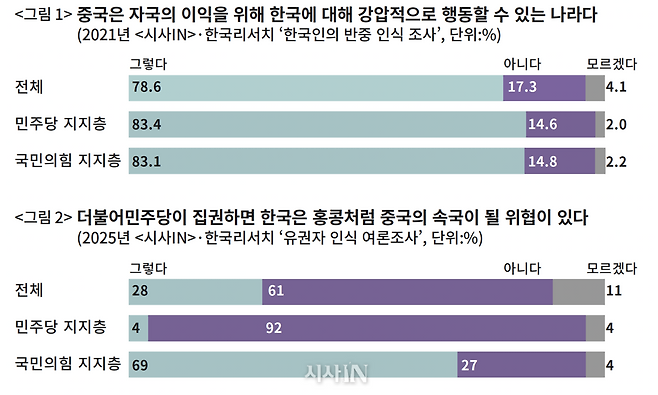 그런데 윤석열의 쿠데타 이후 2025년 불거진 ‘혐중 정서’는 과거의 반중 정서와는 완전히 다르다. 가짜뉴스를 기반으로 현실 정치에서 위력을 떨치는 양상만을 말하는 것이 아니다. 그 ‘기반’이 다르다. 앞서 말한 2021년 〈시사IN〉의 반중 정서 인식 조사와 최근 실시한 〈시사IN〉·한국리서치의 ‘2025 유권자 인식 여론조사’ 결과를 비교해보면 그 차이를 알 수 있다(〈그림〉 1, 2 참조).