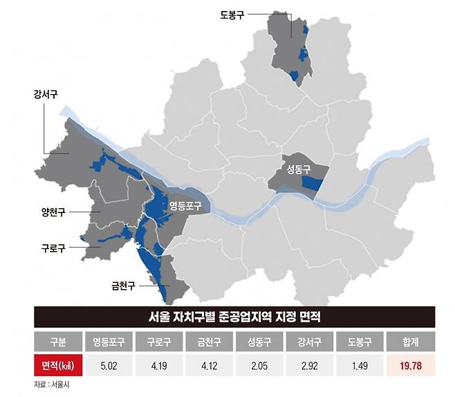 지식산업센터가 많은 자치구는 수십 년 전부터 공장지대가 있던 곳으로 현재까지 준공업지역 면적이 넓게 자리한다. 서울에는 총 1998만㎡에 달하는 준공업지역이 있는데 특히 영등포구(502만㎡), 구로구(419만㎡), 금천구(412만㎡), 강서구(292만㎡), 성동구(205만㎡)에 분포한다. 그중 구로구와 금천구에는 최초의 국가산업단지인 서울디지털단지가 위치한다. 특히 2~3단지인 가산디지털단지는 총 147만㎡ 면적을 자랑한다.