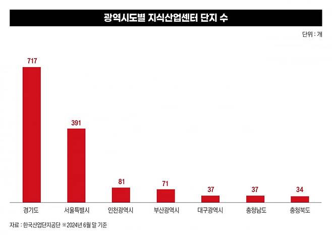 그만큼 지식산업센터 대부분은 서울이나 수도권, 지방 신도시 등 중심지에 위치하고 있다. 한국산업단지공단 집계에 따르면 지난해 6월 말 기준 전국에서 지식산업센터 단지가 가장 많은 광역시도는 경기도로 총 717개 지식산업센터가 자리하고 있었으며 서울이 391개로 그 뒤를 이었다. 여기에 인천(81개)까지 수도권에만 전국 지식산업센터 1539개의 77.3%가 있다.