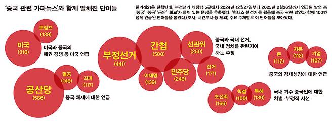 혐중은 12·3 내란사태와 탄핵 국면을 거치며 부정선거 음모론과 결합한다. ‘중국 간첩이 한국 선거에 개입했다’는 식의 가짜뉴스가 대표적이다. 분석한 채팅방에서도 중국 관련어로 ‘부정선거’가 441차례나 언급됐다. 전문가들은 이것이 한국의 정치 상황에 따라 세워진 논리라고 본다. 하남석 서울시립대 중국어문화학과 교수는 “극우 세력은 (부정선거 음모론을 통해) 기존의 반중 정서에 올라타서 아주 적극적으로 내란을 옹호하고 정당화하고 있고, 이를 위해 가짜뉴스를 섞어 이야기하고 있다”고 했다. 김진호 이사는 “중국 혐오와 부정선거는 우연한 결합이다. 부정선거 음모론은 근대적 합리성인 ‘선거’제도에 대한 거부감이다. 이를 사회마다 표출하는 서사는 다를 것이고, 한국은 혐중과 연결된 것”이라고 설명했다.