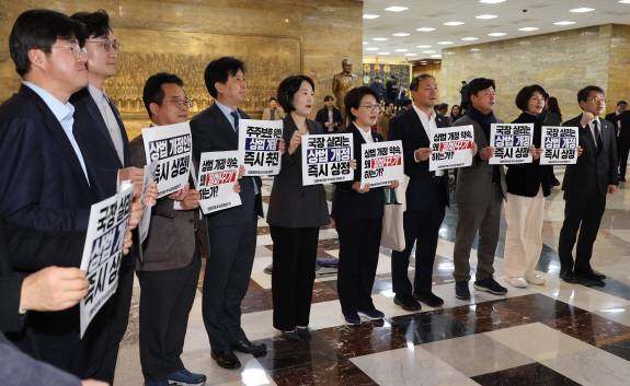 [더불어민주당 의원들이 27일 오후 서울 여의도 국회 본회의장 앞에서 상법개정안 상정을 촉구하는 손팻말을 들고 있다. (사진=연합뉴스)]