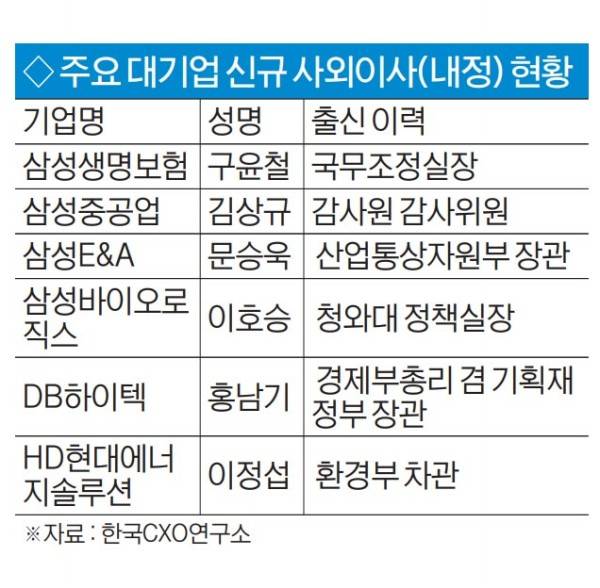 장차관급 인사를 올해 신규 사외이사로 영입한 곳은 주로 삼성 계열사였다. 삼성생명보험(구윤철 전 국무조정실 실장), 삼성중공업(김상규 전 감사원 감사위원), 삼성E&A(문승욱 전 산업통상자원부 장관), 삼성바이오로직스(이호승 전 대통령실 정책실장)이 포함됐다. DB하이텍(홍남기 전 경제부총리 겸 기획재정부 장관), HD현대에너지솔루션(이정섭 전 환경부 차관)도 장차관 출신 관료를 내정했다.
