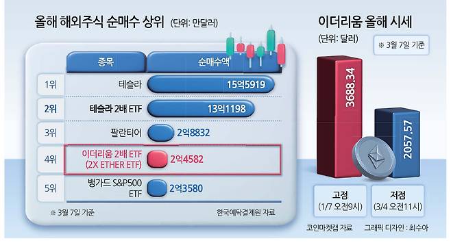국내 투자자들이 올해 사들인 해외주식 상위 5개 중 이더리움 수익률을 2배 추종하는 상장지수펀드(ETF)가 포함됐다.
