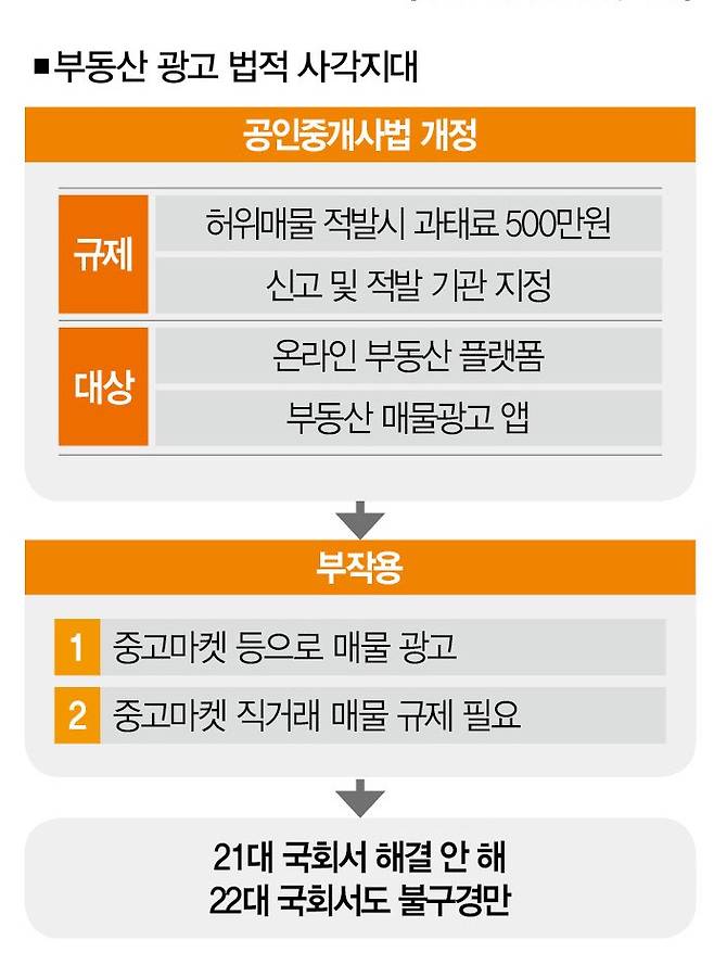 특히 온라인 플랫폼이나 앱으로 '집'을 찾는 사람들이 늘면서 허위매물은 더 큰 문제로 떠올랐다. 결국 정부가 나섰다. 2020년 7월 공인중개사법 일부를 개정해 '허위매물을 올릴 경우 적발 매물 건당 500만원의 과태료를 물리는' 처벌 규정을 신설했다. 온라인 부동산 플랫폼, 부동산 매물광고 플랫폼이 있는 앱(직방ㆍ다방 등)도 모두 규제 대상이었다.