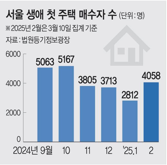 대출 규제가 풀린 영향이 주요하게 작용했다는 분석이다. 주택담보대출을 받기가 한층 수월해지고 금리 인하로 이자 부담이 줄면서 부동산 상승기 매수 심리를 자극한 것으로 풀이된다. 서울 생애 첫 집합건물 매수자 수는 대출 규제가 한창이던 지난해 10월 5167명으로 정점을 찍은 뒤 감소세로 전환해 11월 3805명, 12월 3713명, 올해 1월 2812명으로 3개월 연속 줄어들었다.