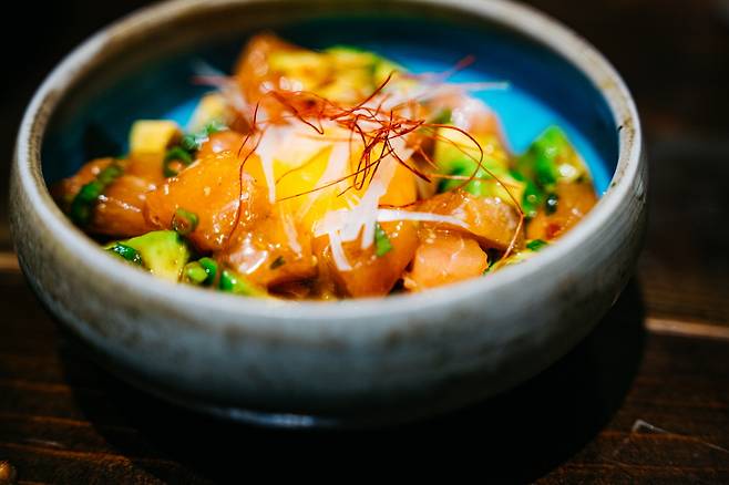 자칫 밋밋할 수 있는 삼치(サワラ, 사와라)에 반죽으로 고소한 맛을, 푸릇푸릇한 유채 소스로 색감과 상큼함을 더했다. 맛의 레이어가 켜켜이 쌓여 있어 먹는 순간 세심하게 음미하게 한다.