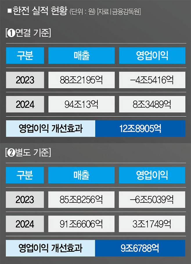 "별도 기준으로 한전의 영업이익은 3조1749억원이다. 2023년엔 6조5039억원의 영업손실을 냈다. 1년 만에 영업이익이 대략 9조7000억원 늘어난 셈이다. 여기서 2023년 전기요금 인상 효과는 4조5000억원, 2024년 전기요금 인상과 판매량 증가에 따른 효과는 1조5000억원이다. 이를 제외한 3조7000억원은 고강도 자구노력의 결과다. 미세먼지 계절관리제 탄력적 운영(고원가 발전기 운영 조절)으로 1조4000억원, 발전연료 개별소비세 인하 연장으로 1조원, 업무 전반에 걸친 효율 향상으로 7000억원, 신재생에너지공급의무(RPS) 정산제도 개선으로 4000억원, 고객참여 부하차단제도 도입으로 2000억원을 절감했다. 정부 경영평가 성과급 반납(123억원), 임금 인상분 반납(23억원), 148명의 희망퇴직(60억원), 직원 복지 축소 등의 노력도 있었다."