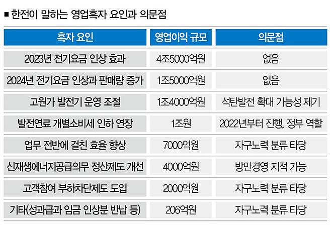 여기까지만 보면 한전의 설명엔 큰 문제가 없어 보인다. 전기요금 인상분과 연료비 등을 강조하면서 일부 자구노력을 언급하고 있어서다. 성과급이나 임금 반납, 희망퇴직, 시장제도 개선 등 한전의 자구노력도 분명 인정받아야 마땅하다.