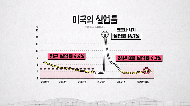 이런 말씀들을 하실 수 있어요. '그건 코로나 때 미국 고용시장이 엄청나게 출렁거리면서 실업률이 몇십 퍼센트까지 급등했잖아요. 코로나 때문인 것 같다'. 아 그러면 그 기간 제외하고 보면, 코로나 이전 2015년~2019년 5년 평균 미국의 실업률 수준은 4.4%입니다. 8월에 높아졌어도 여전히 4.4%보다 낮았잖아요. 그럼 지금 미국의 고용 시장이 아주 안 좋냐? 아닌 거죠. 나쁘지 않았습니다.