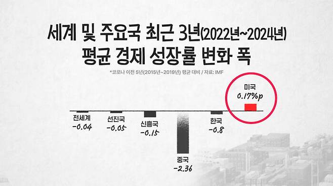 제가 보기에도 미국은 지금까지 굉장히 좋았어요. 가령 미국 같은 경우에는 지지난해 경제 성장률이 2.9%, 그리고 지난해 경제 성장률이 아직 공식적으로 발표되지는 않았지만 2.8% 정도 되는 것으로 지금 추산이 되고 있습니다. 굉장히 좋은 거예요. 이게 어느 정도로 좋은 거냐면, 많은 나라들의 경제 성장률이 코로나 이전 5년 평균 대비 최근 3년 평균 경제 성장률을 비교해 보면 대부분 다 낮아졌어요. 그러니까 세계 경제 성장률 평균도 낮아졌고요. 선진국 평균도 낮아졌고요, 신흥국 평균은 그것보다 더 떨어졌고요.